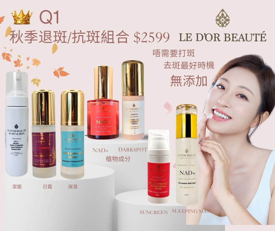 中秋超級優惠七件套裝:NAD睡眠面膜+三重幹細胞去斑精華+玫瑰精華+抗皺精華+NAD防曬乳+潔面泡泡(送刮砂板一件)
